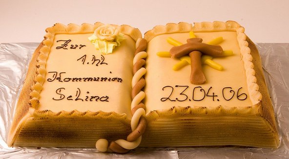 Jede Torte wird mit hauchdünnem Marzipan eingedeckt und mit einer Marzipankordel versehen. Die linke Buchseite wird mit einem Schriftzug nach Wunsch, die rechte Buchseite mit einem Marzipankreuz verziert. Natürlich wird der Schriftzug individuell erstellt.