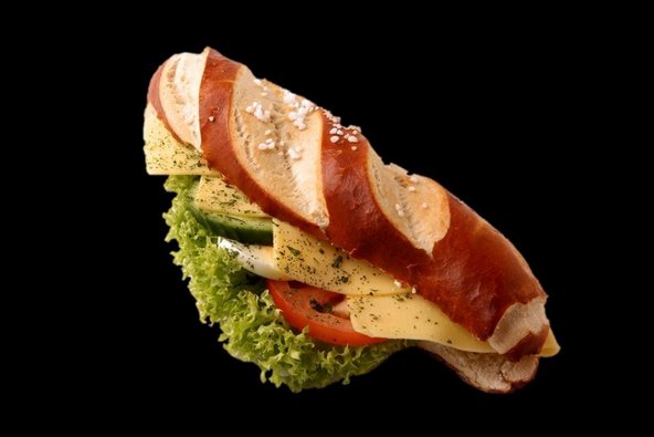 Laugenstange mit Frischkäse bestrichen, mit Gouda, Tomate, Gurke, Ei & Salat belegt & mit Petersilie bestreut