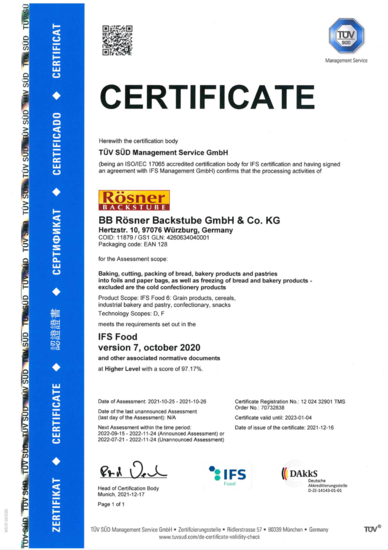 Seit 2007 wird unser Betrieb jährlich von neutralen Experten mit dem International Food Standard „IFS“ Version 5 auf Higher Level ausgezeichnet. Seit 2013 hat die BB Rösner Backstube GmbH & Co KG. die Anforderungen an die neue Version 6 auf Higher Level bestanden. Unser Unternehmen wird seit dem Jahr 2021 mit dem International Food Standard "IFS" Version 7 auf Higher Level ausgezeichnet.